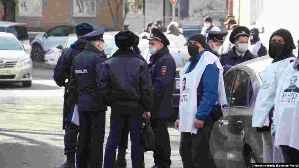 Паралельно під будівлею підконтрольно Кремлю Кримського гарнізонного військового суду у Сімферополі зібралися жителі Криму, щоб також підтримати фігурантів бахчисарайської «справи Хізб ут-Тахрір». Російські силовики розпочали масові затримання. За попередніми даними активістів, щонайменше 30 кримських татар доставили до відділення поліції. Зокрема, у Сімферополі до автозаку завели журналістів, які знімали те, що відбувається.